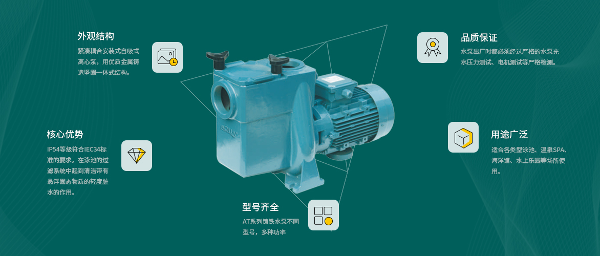 AT系列鑄鐵水泵不同型號,多種功率,適合各類型泳池、溫泉SPA、海洋館、景觀池、水上樂園等場所使用。